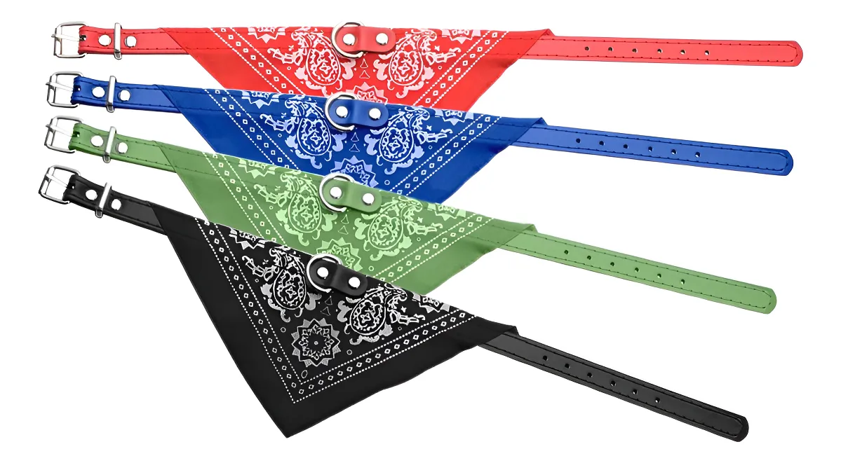 Bandana Integrada: Incluye un pañuelo de tela suave con el clásico estampado paisley (bandana), fijado de forma segura al collar para que no se desplace ni se pierda.