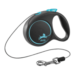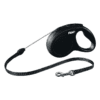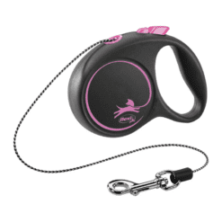 Correa Flexi Black Design retráctil para perros con sistema antitensión que evita tirones bruscos. Cuenta con una banda reflectante para mayor visibilidad en condiciones de poca luz. Disponible en tallas XS (3m), S (5m) y M (5m).