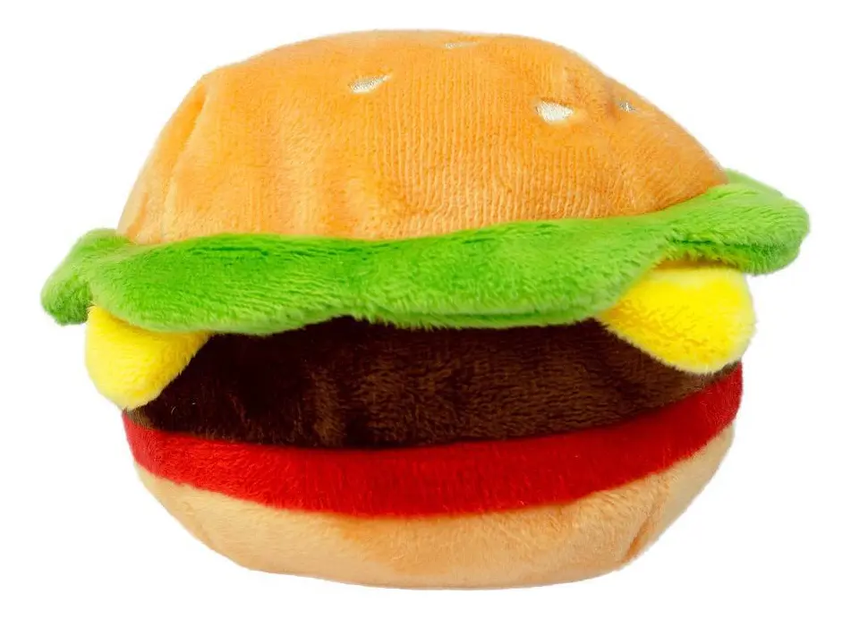 Divertido juguete de peluche con forma de hamburguesa. Está fabricado con tela suave de alta calidad convirtiéndose en el compañero perfecto para los momentos de juego y descanso de tu mascota.