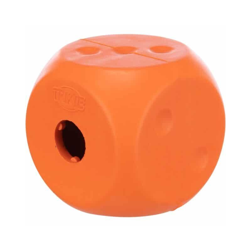 Dado interactivo de caucho natural. Sus dimensiones de 5 x 5 x 5 cm lo hacen ideal para razas pequeñas. Su estructura robusta y silenciosa al rebotar permite insertar snacks en su interior, convirtiendo la hora de la merienda en un desafío divertido y prolongado.